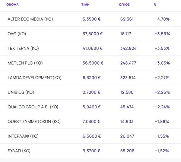Οι μετοχές με τη μεγαλύτερη άνοδο ήταν: