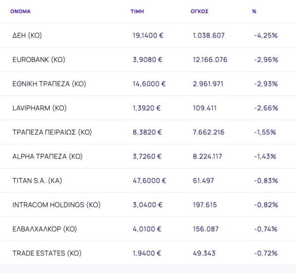 Οι μετοχές με τη μεγαλύτερη πτώση ήταν: