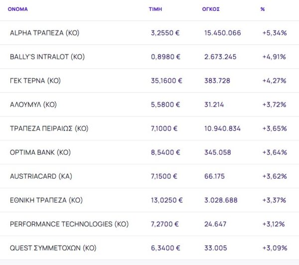 Οι μετοχές με τη μεγαλύτερη άνοδο ήταν: