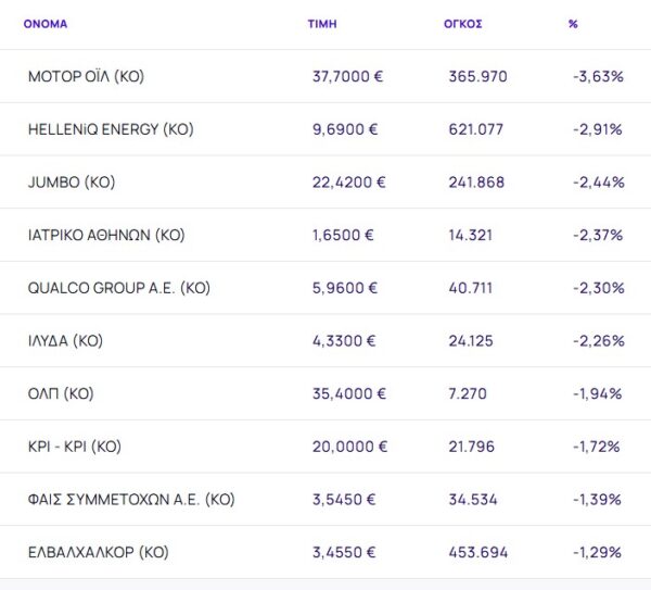 Οι μετοχές με τη μεγαλύτερη πτώση ήταν: