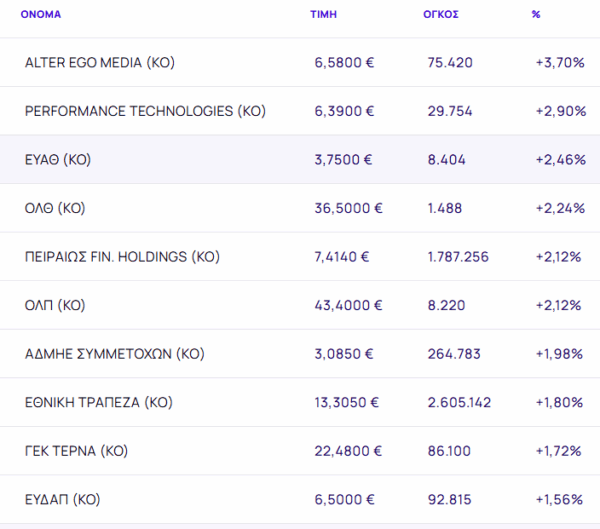 Οι μετοχές με τη μεγαλύτερη άνοδο ήταν: