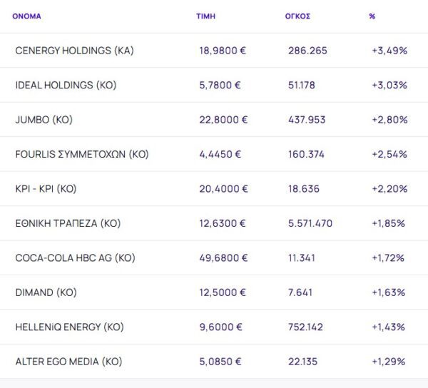 Από εκεί και πέρα στην υψηλή κεφαλαιοποίηση, η Cenergy ξεχώρισε με +3,49% στα 18,98 ευρώ, όπως και η η Jumbo με +2,8% στα 22,8 ευρώ και ακολούθησαν η Coca-Cola με +1,72% στα 49,68 ευρώ, η HELLENiQ ENERGY με +1,43% στα 9,6 ευρώ και η ElvalHalcor με +1,17% στα 3,465 ευρώ.