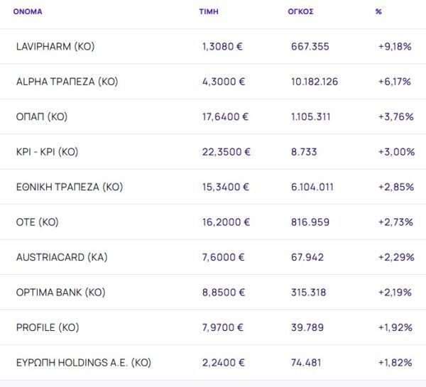 Οι μετοχές με τη μεγαλύτερη άνοδο ήταν: