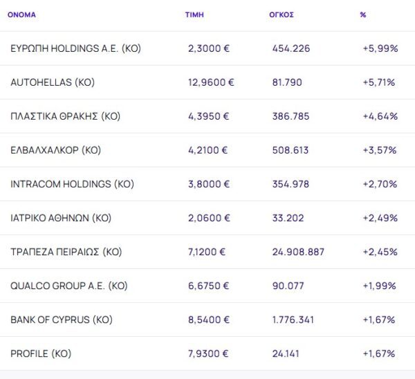 Οι μετοχές με τη μεγαλύτερη άνοδο ήταν: