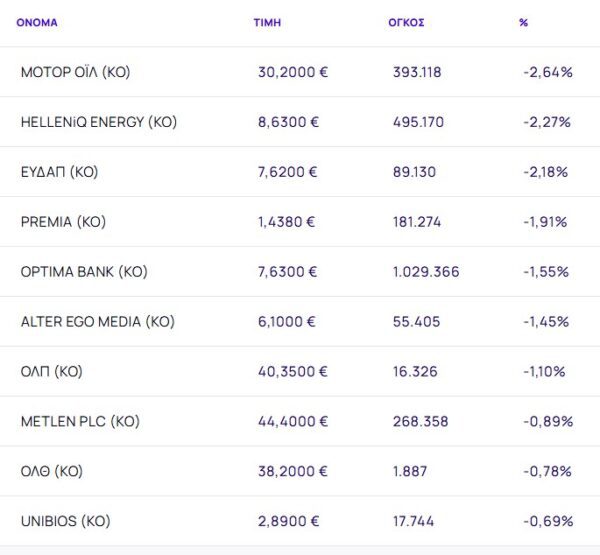 Οι μετοχές με τη μεγαλύτερη πτώση ήταν:
