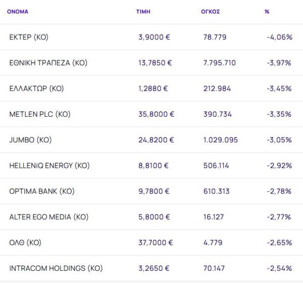 Οι μετοχές με τη μεγαλύτερη πτώση ήταν: