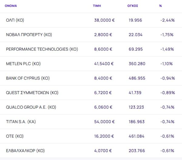 Οι μετοχές με τη μεγαλύτερη πτώση ήταν: