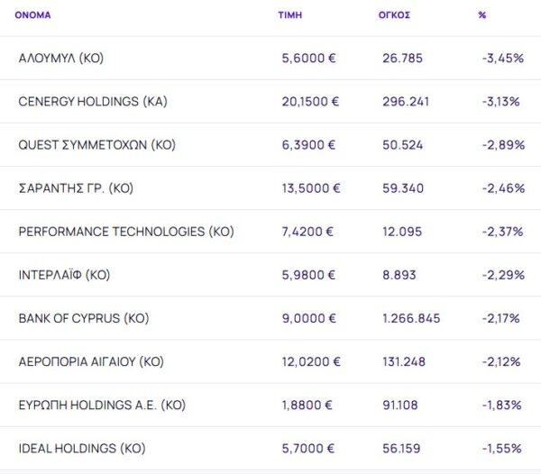 Οι μετοχές με τη μεγαλύτερη πτώση ήταν: