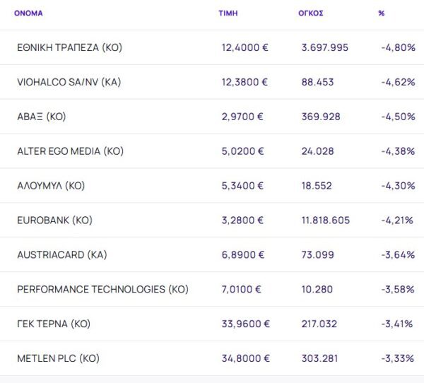 Οι μετοχές με τη μεγαλύτερη πτώση ήταν: