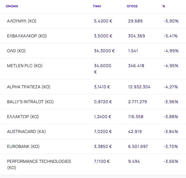 Οι μετοχές με τη μεγαλύτερη πτώση ήταν: