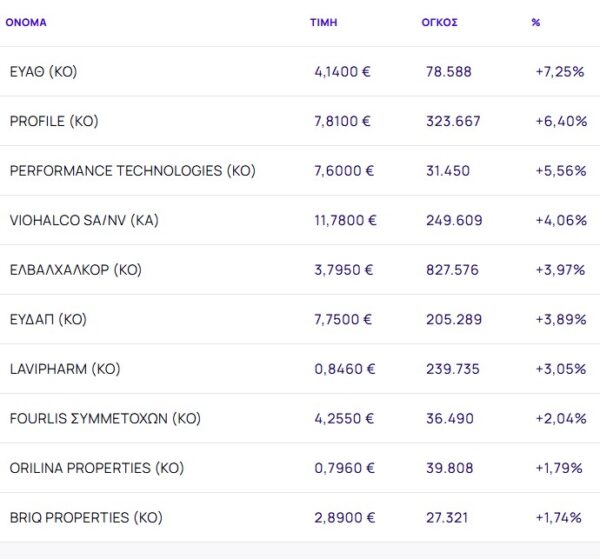 Οι μετοχές με τη μεγαλύτερη άνοδο ήταν: