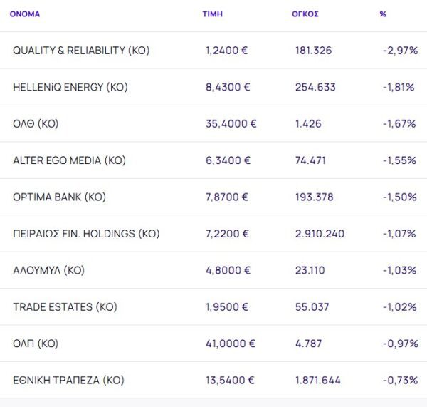 Οι μετοχές με τη μεγαλύτερη πτώση ήταν:
