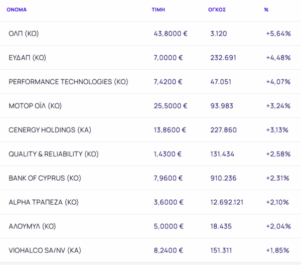 Οι μετοχές με τη μεγαλύτερη άνοδο ήταν: