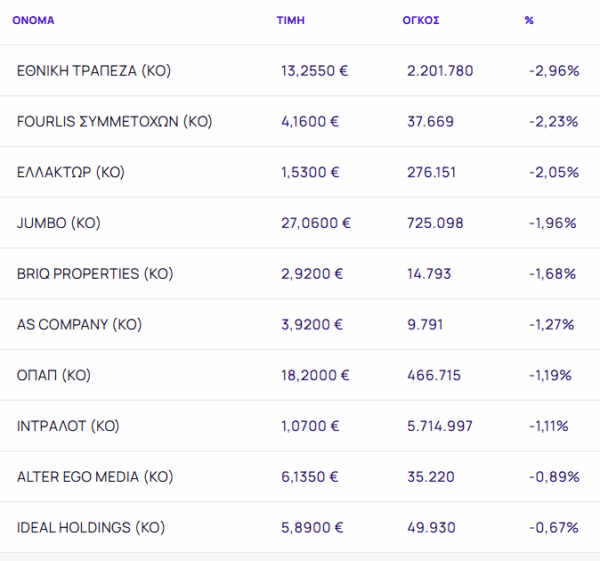 Οι μετοχές με τη μεγαλύτερη πτώση ήταν:
