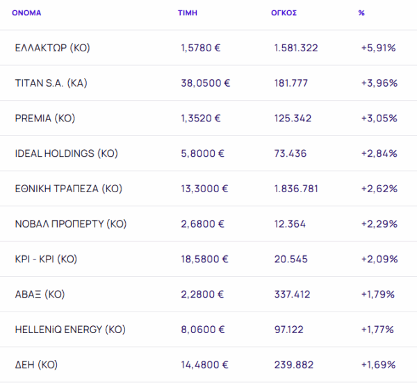 Οι μετοχές με τη μεγαλύτερη άνοδο ήταν: