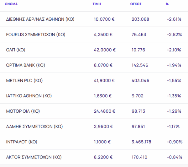 Οι μετοχές με τη μεγαλύτερη πτώση ήταν: