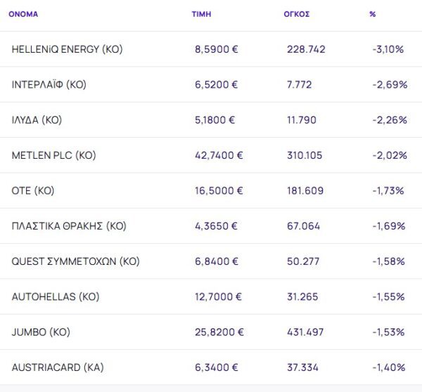 Οι μετοχές με τη μεγαλύτερη πτώση ήταν: