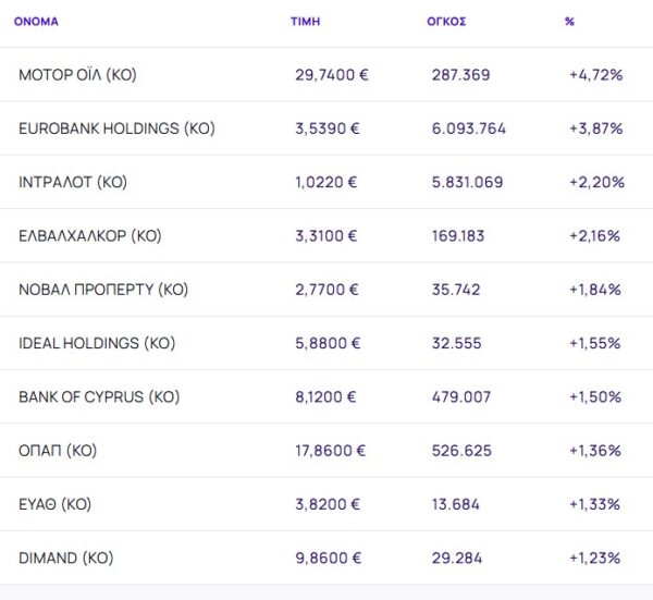 Στον αντίποδα, η Aegean κατέγραψε σημαντικές απώλειες με -2,37% στα 14 ευρών και ακολούθησαν η ΓΕΚ ΤΕΡΝΑ πιο ήπια με -0,81% στα 24,64 ευρώ, η Titan με -0,55% στα 45,20 ευρώv και η Metlen με -0,54% στα 43,92 ευρώ.