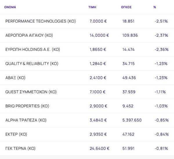 Οι μετοχές με τη μεγαλύτερη πτώση ήταν: