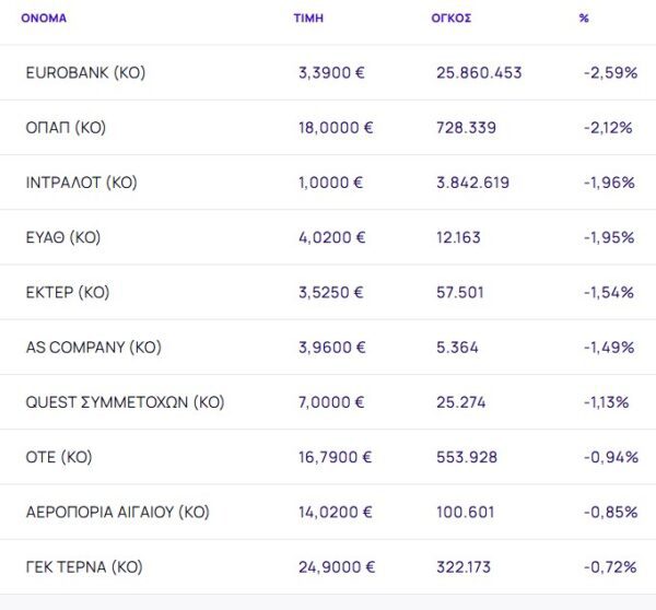 Οι μετοχές με τη μεγαλύτερη πτώση ήταν: