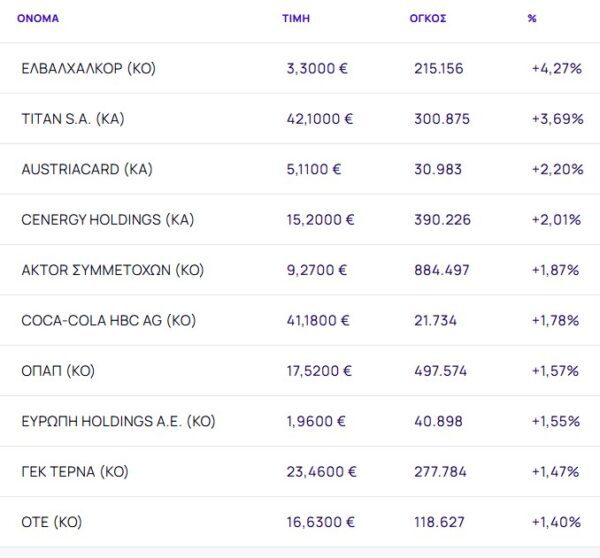 Οι μετοχές με τη μεγαλύτερη άνοδο ήταν: