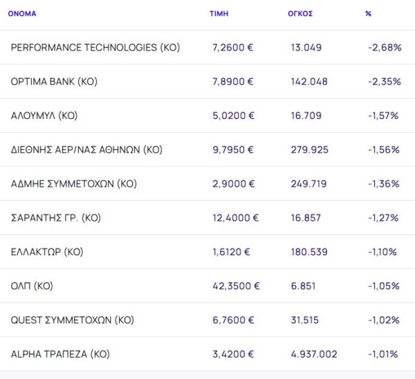 Οι μετοχές με τη μεγαλύτερη πτώση ήταν: