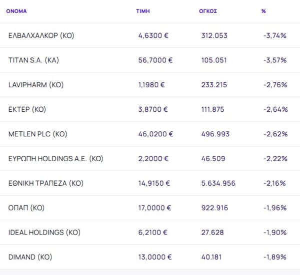 Οι μετοχές με τη μεγαλύτερη πτώση ήταν: