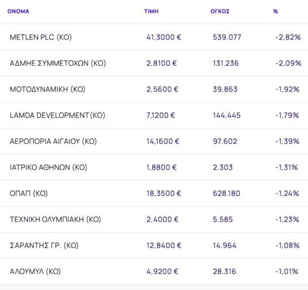 Οι μετοχές με τη μεγαλύτερη πτώση ήταν: