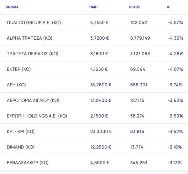 Οι μετοχές με τη μεγαλύτερη πτώση ήταν: