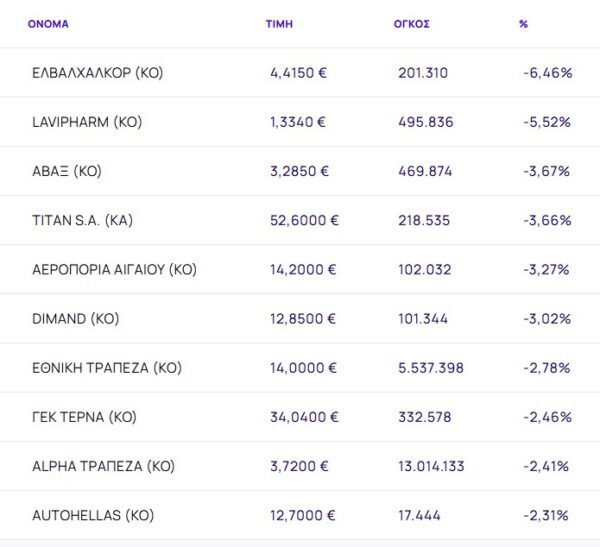 Οι μετοχές με τη μεγαλύτερη πτώση ήταν: