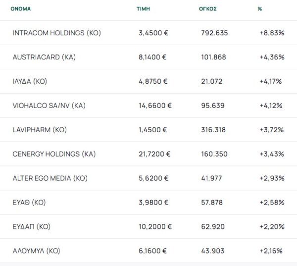 Οι μετοχές με τη μεγαλύτερη άνοδο ήταν: