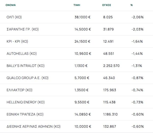 Οι μετοχές με τη μεγαλύτερη πτώση ήταν: