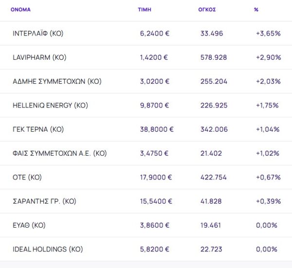 Οι μετοχές με τη μεγαλύτερη άνοδο ήταν: