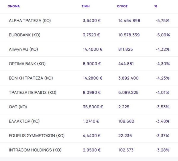 Οι μετοχές με τη μεγαλύτερη πτώση ήταν: