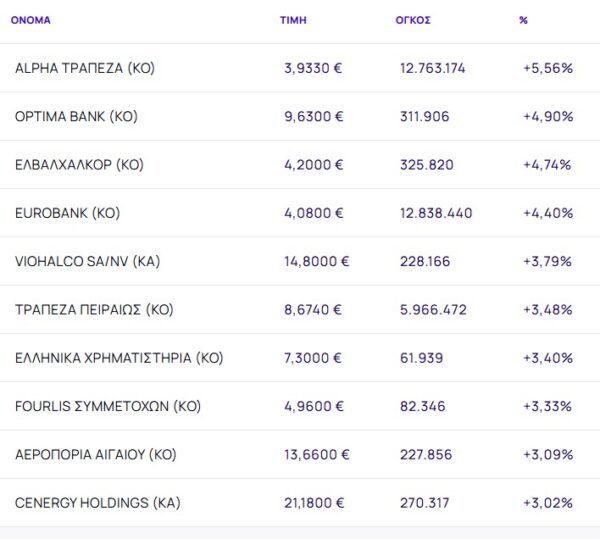 Οι μετοχές με τη μεγαλύτερη άνοδο ήταν: