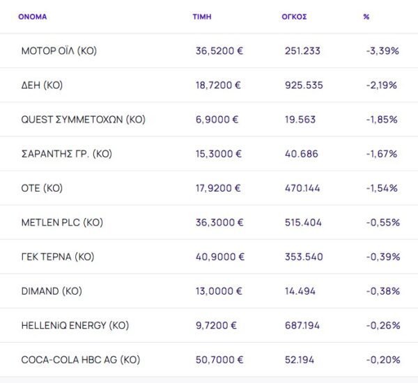 Οι μετοχές με τη μεγαλύτερη πτώση ήταν: