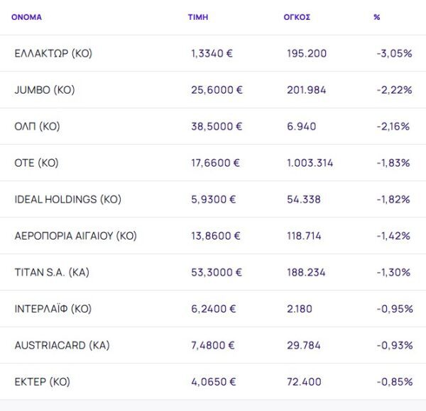 Οι μετοχές με τη μεγαλύτερη πτώση ήταν: