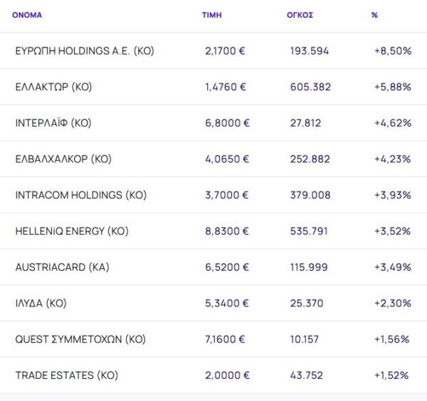 Οι μετοχές με τη μεγαλύτερη άνοδο ήταν: