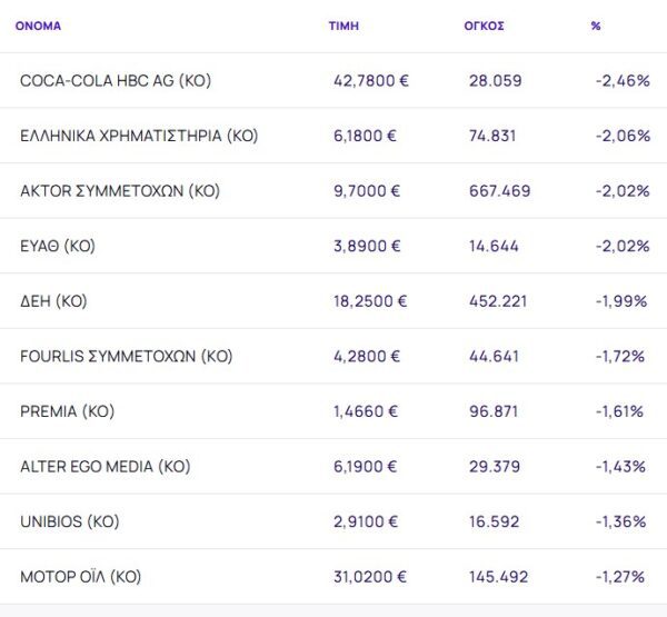 Οι μετοχές με τη μεγαλύτερη πτώση ήταν: