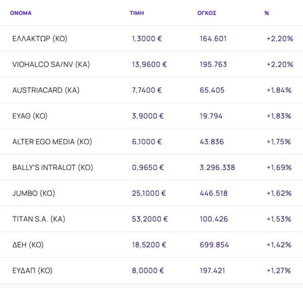 Οι μετοχές με τη μεγαλύτερη άνοδο ήταν: