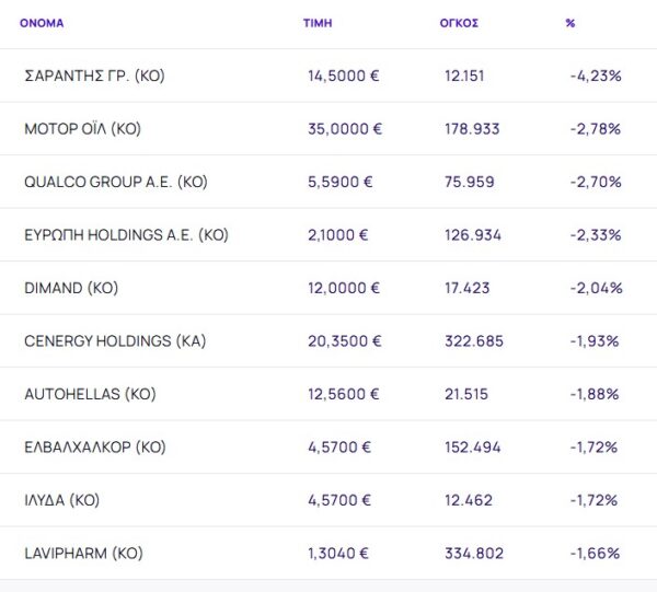 Οι μετοχές με τη μεγαλύτερη πτώση ήταν