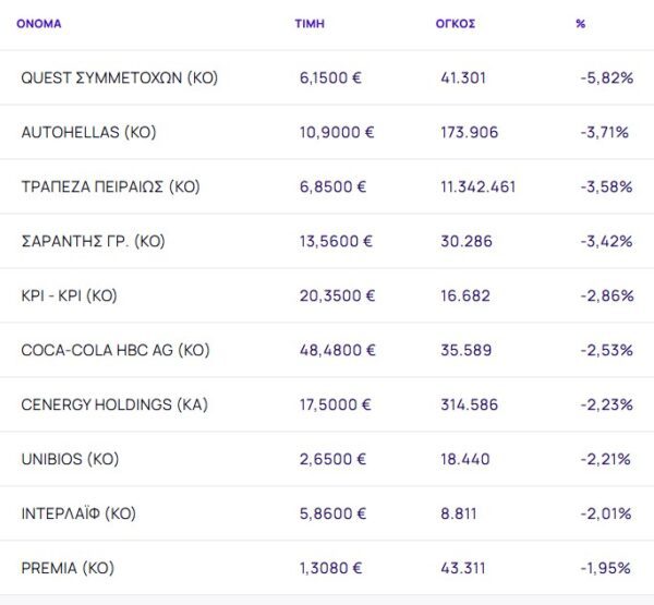 Οι μετοχές με τη μεγαλύτερη πτώση ήταν: