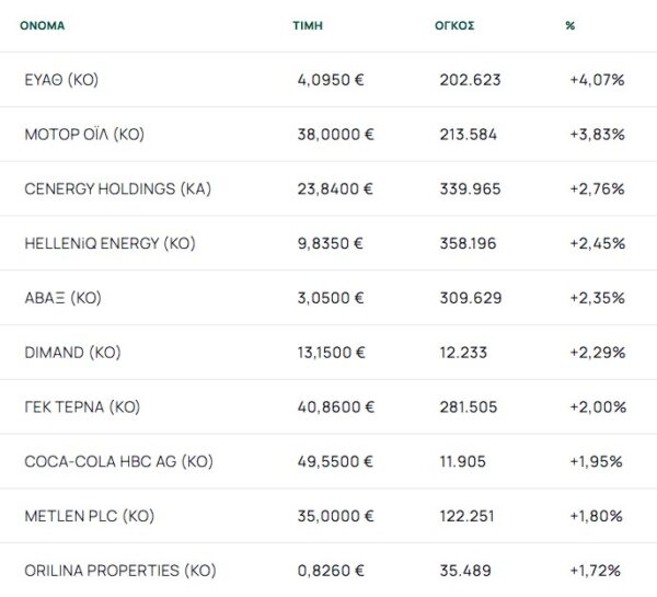 Οι μετοχές με τη μεγαλύτερη άνοδο ήταν: