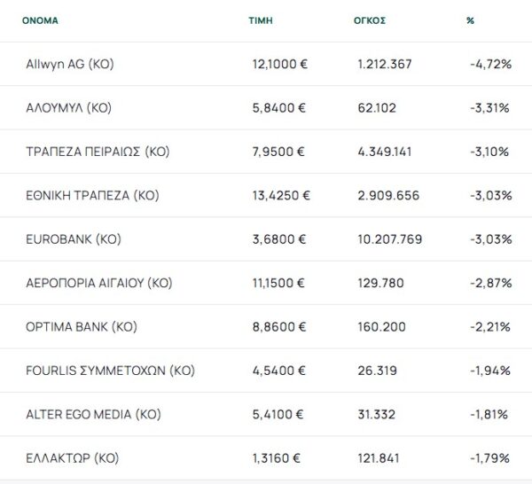 Οι μετοχές με τη μεγαλύτερη πτώση ήταν: