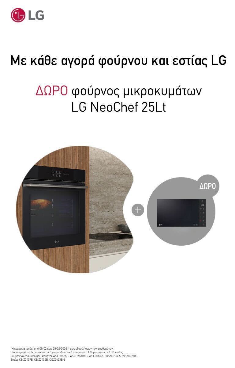 Με κάθε συνδυαστική αγορά επιλεγμένων κωδικών εντοιχιζόμενου φούρνου και επαγωγικής εστίας , ο καταναλωτής αποκτά δώρο ένα φούρνο μικροκυμάτων LG NeoChef™ 25 λίτρων, στο πλαίσιο προωθητικής ενέργειας της LG.