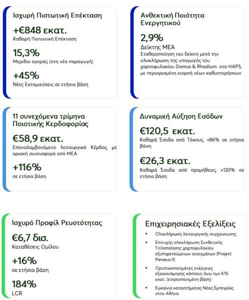 Tα βασικά έσοδα του Ομίλου ενισχύθηκαν κατά 92% σε ετήσια βάση και διαμορφώθηκαν στα €146,8 εκατ. με αποτέλεσμα τα επαναλαμβανόμενα Λειτουργικά Έσοδα του Ομίλου να ανέλθουν σε €164,5 εκατ. έναντι €86,2 εκατ., σημειώνοντας αύξηση 91% σε ετήσια βάση. Τα κεφάλαια υπό διαχείριση ανήλθαν συνολικά σε € 840 εκατ., συμπεριλαμβανομένων αμοιβαίων κεφαλαίων, ομολόγων και εντόκων γραμματίων, σημειώνοντας αύξηση 11% σε σχέση με το τέλος έτους 2024. Ήδη, επενδύουμε σε στρατηγικές συνεργασίες με διεθνείς οίκους, ώστε να προσφέρουμε στην ελληνική αγορά υψηλής ποιότητας συμβουλευτικές υπηρεσίες και εργαλεία διαχείρισης περιουσίας. Σήμερα, έχουμε δημιουργήσει πλέον μια ενιαία Τράπεζα, με νέα εικόνα και ταυτότητα, που προσφέρει αναβαθμισμένη εμπειρία εξυπηρέτησης από το ψηφιακό περιβάλλον έως το κατάστημα, συνδυάζοντας την ανθρώπινη προσέγγιση με τη χρήση της τεχνολογίας , για να προσφέρουμε προσωποποιημένη εξυπηρέτηση σε ιδιώτες και επιχειρήσεις.