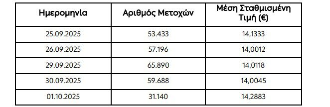 Η Δημόσια Επιχείρηση Ηλεκτρισμού Α.Ε. («ΔΕΗ»), γνωστοποίησε στο Χρηματιστήριο Αθηνών ότι κατά το χρονικό διάστημα από 25.09.2025 μέχρι και 01.10.2025, αγόρασε μέσω συναλλαγών στο Χρηματιστήριο Αθηνών συνολικά 267.347 Ίδιες Μετοχές, ως εξής: