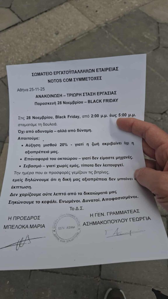 Τρίωρη στάση εργασίας 14:00 – 17:00 πραγματοποιούν οι εργαζόμενοι στη «Notos Com», σήμερα 28/11 μέρα του «Black Friday», με απόφαση του σωματείου τους.