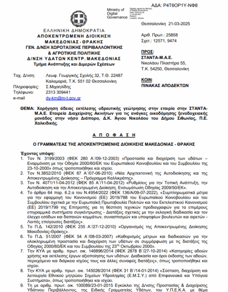 Πρόκειται για έγγραφο από την αποκεντρωμένη διοίκηση Μακεδονίας-Θράκης, το οποίο συνεπάγεται τη χορήγηση άδειας εκτέλεσης υδρευτικής γεώτρησης στην εταιρία στην ΣΤΑΝΤΑ Μ.Α.Ε. Εταιρεία Διαχείρισης Ακινήτων για τις ανάγκες οικοδόμησης ξενοδοχειακής μονάδος στην νήσο Διάπορο, Δ.Κ. Άγιου Νικολάου του Δήμου Σιθωνίας, Π.Ε. Χαλκιδικής με ισχύ για έναν χρόνο, δηλαδή λήγει στα τέλη Μαρτίου του 2026.