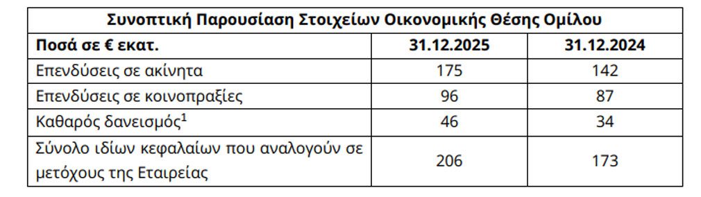 Η εύλογη αξία των επενδύσεων σε ακίνητα του Ομίλου ανήλθε την 31.12.2025 σε περίπου €175 εκατ. (31.12.2024: €142 εκατ.), ενώ η εύλογη αξία των επενδύσεων σε κοινοπραξίες ανήλθε την 31.12.2025 σε περίπου €96 εκατ. (31.12.2024: €87 εκατ.).